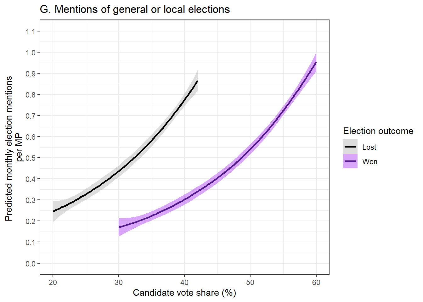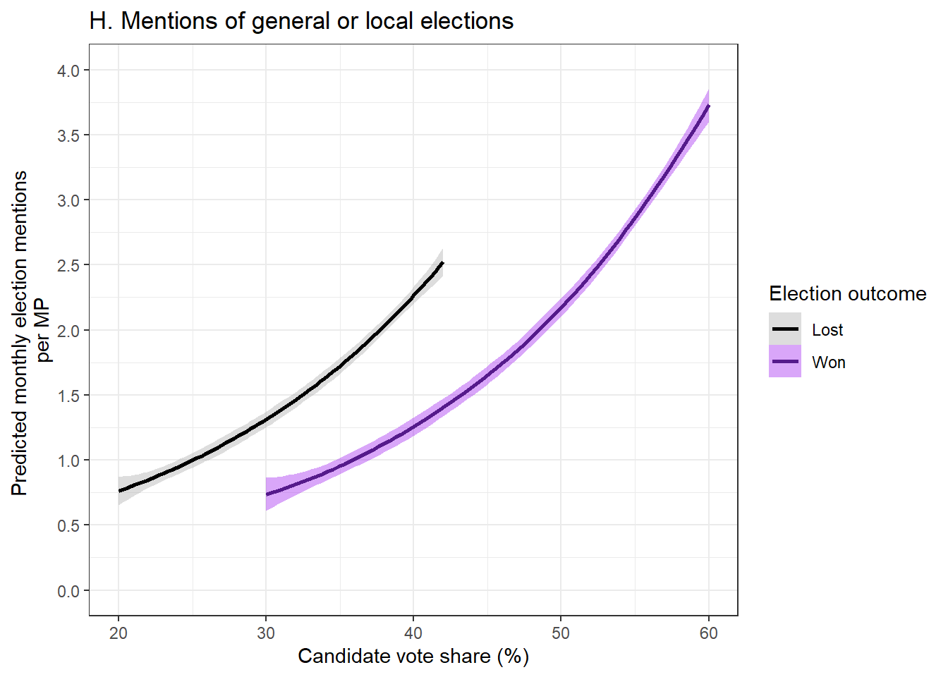 ggplot(newdata1, aes(x = candidate_vote_share_perc, y = phat_elect_cool_kids, colour =factor(won_election), fill =factor(won_election))) +#geom_point() +#geom_line() +geom_smooth(method ="loess", se =TRUE, formula = y ~ x) +#facet_wrap(~ camper) +labs(x ="Candidate vote share (%)", y ="Predicted monthly election mentions \nper MP",colour ="Election outcome", # Legend title for colourfill ="Election outcome",title ="H. Mentions of general or local elections") +# Legend title for fillscale_colour_manual(values =c("0"="black", "1"="purple4"),labels =c("Lost", "Won")) +scale_fill_manual(values =c("0"="darkgrey", "1"="purple"),labels =c("Lost", "Won")) +#scale_x_continuous(# breaks = seq(20, 60, by = 10)#) + scale_y_continuous(breaks =seq(0, 4, by = .5) ) +coord_cartesian(xlim =c(20, 60), ylim =c(0, 4)) +theme(axis.text =element_text(size =14), axis.title =element_text(size =17), plot.title =element_text(size =18, hjust =0.5),legend.text =element_text(size =16),legend.title =element_text(size =18) ) +theme_bw()