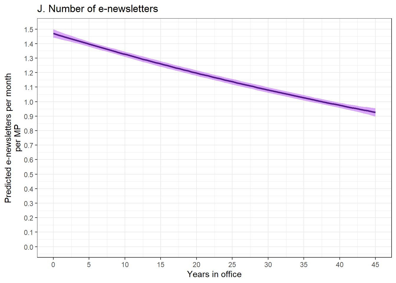 Does the length of an MP’s tenure in office impact their e-newsletter habits? In my anecdotal experience browsing through MP websites to put together this database, older MPs with longer tenures tend to be less tech-savvy than their younger peers. That may result in less e-newsletter usage. Yet, longer tenured MPs should, in theory, be more established and organised than their less-experienced peers. One might reasonably think that could lead to more consistent communication.