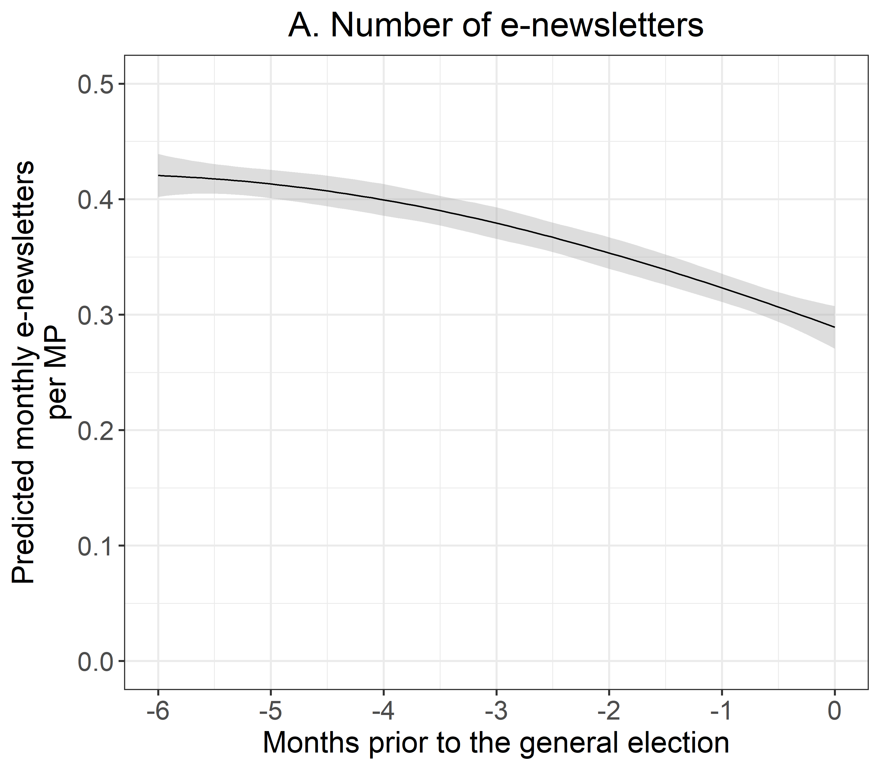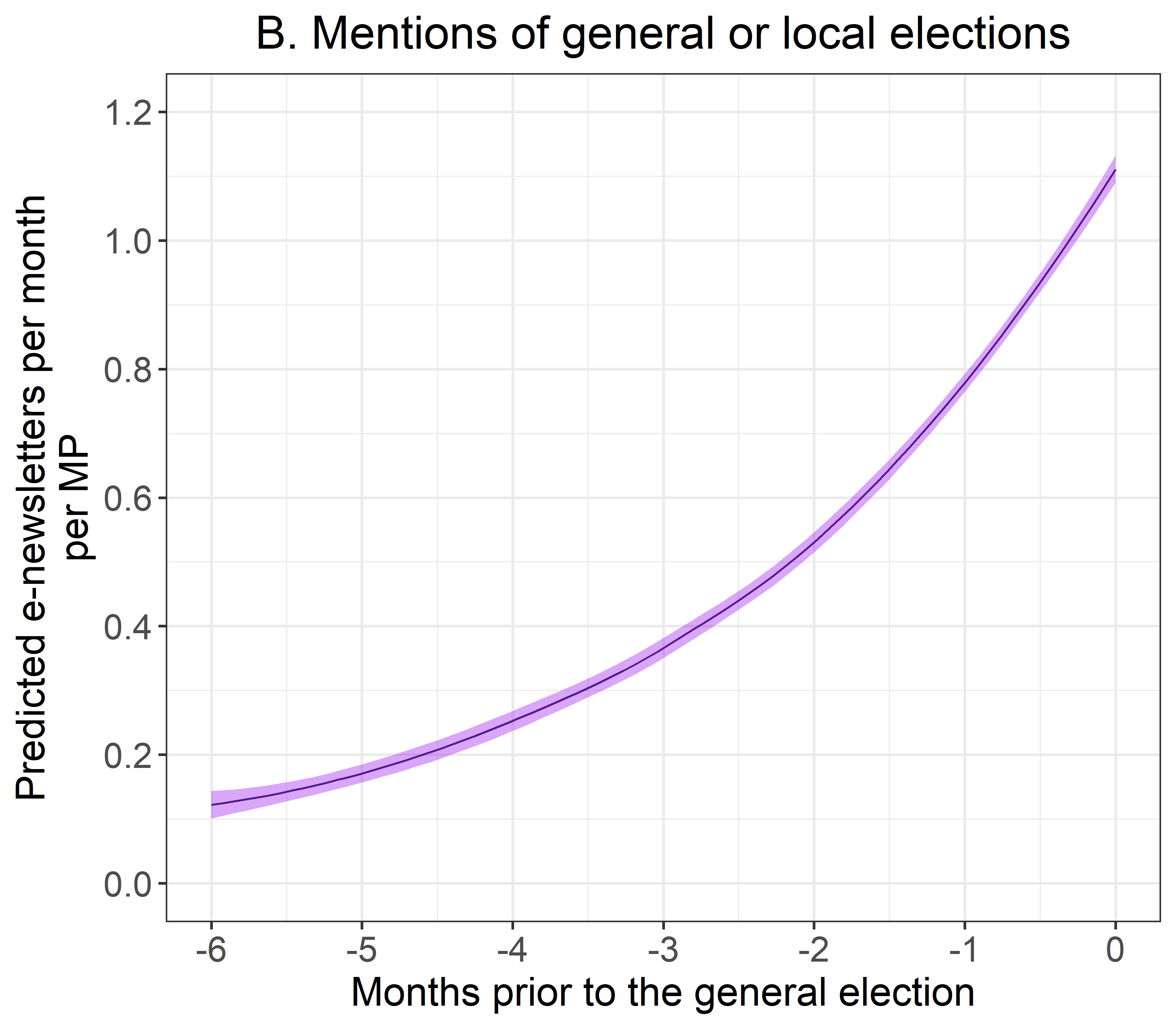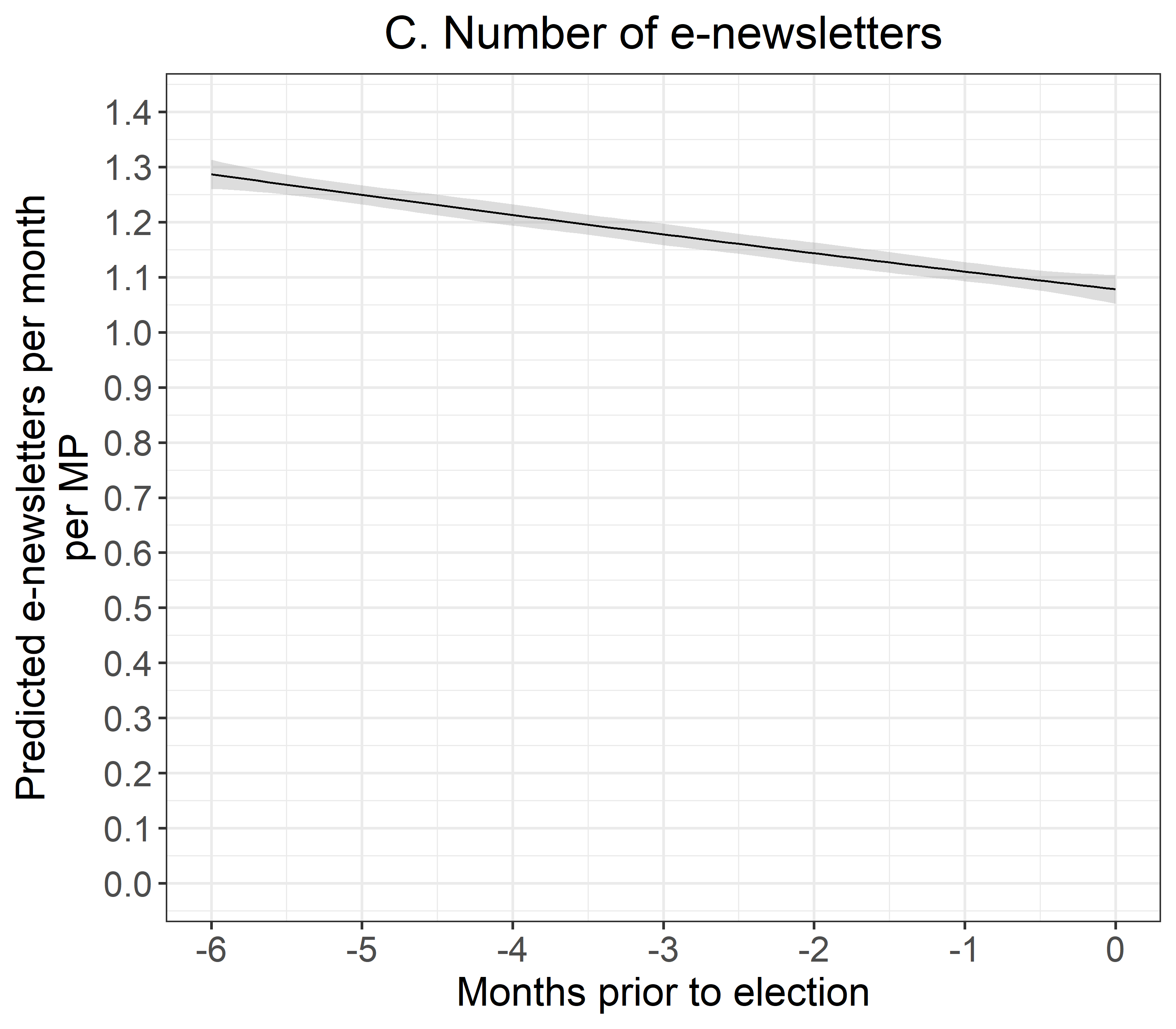 After plotting the predicted number of e-newsletters an MP sends per month over time (Figure A and Figure C), we see a small dip in the number of e-newsletters as election day approaches. This trend is likely partially driven by a number of MPs that chose to shift their attention to other matters right around the time parliament dissolved (30 May, 2024). While anecdotal, this trend is underscored the many MPs who used the opportunity to send wistful final farewells to their constituents.5