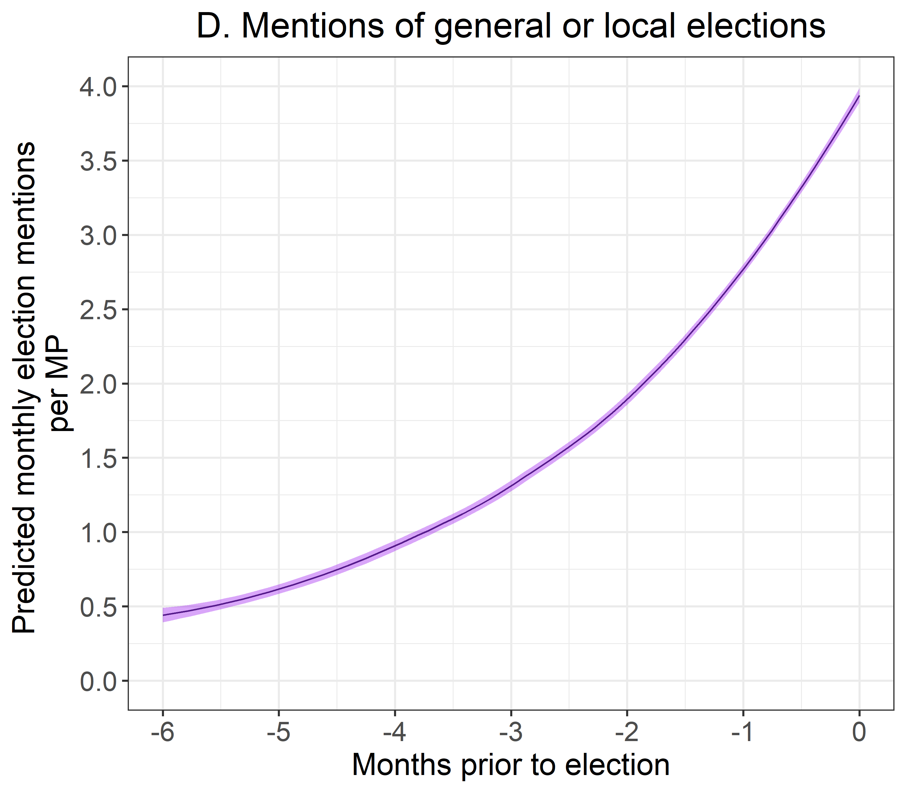 ggplot(newdata1, aes(x = months_prior, y = phat_elect_all, colour = main_party_name, fill = main_party_name)) +#geom_point() +#geom_line() +geom_smooth(method ="loess", se =TRUE, formula = y ~ x) +#facet_wrap(~ main_party_name) +labs(x ="Months prior to general election", y ="Predicted monthly election mentions \nper MP",colour ="Party",fill ="Party",title ="E. Mentions of general or local elections") +scale_colour_manual(values =c("Conservative"="blue4", "Labour"="red4", "Liberal Democrat"="orange2")) +scale_fill_manual(values =c("Conservative"="blue", "Labour"="red", "Liberal Democrat"="orange")) +scale_x_continuous(breaks =seq(-6, 0, by =1) ) +scale_y_continuous(breaks =seq(0, 1.6, by = .2) ) +coord_cartesian(xlim =c(-6, 0), ylim =c(0, 1.6)) +theme(axis.text =element_text(size =14), axis.title =element_text(size =17), plot.title =element_text(size =18, hjust =0.5),legend.text =element_text(size =16),legend.title =element_text(size =18) ) +theme_bw()
