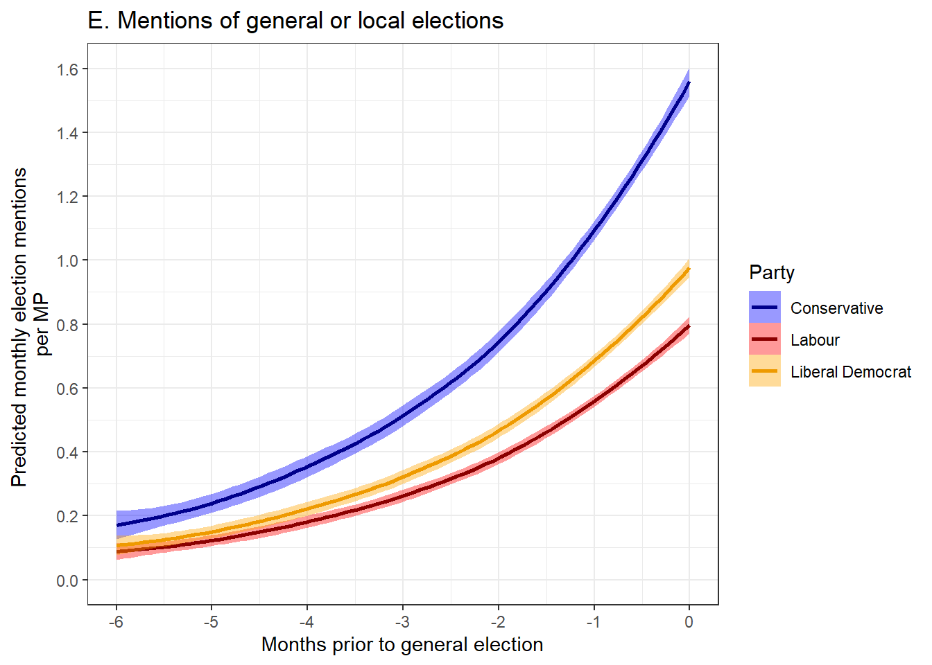 So what does one make of these findings? A likely driving factor is the fact that Conservative MPs generally write far more e-newsletters than their Labour or Liberal Democrat counterparts. This underscores a key assumption behind my choice to use zero-inflated modelling: since the average Conservative MP is more likely to have a e-newsletter in the first place, the Conservatives simply have more opportunities to discuss the election (or any topic really) in those e-newsletters. Yet, if we account for this, we see that the incentives surrounding election-related discussion do not appear to be especially unique to Conservatives. Among most MPs, the election simply becomes an increasingly salient point of discussion over time, irrespective of party.