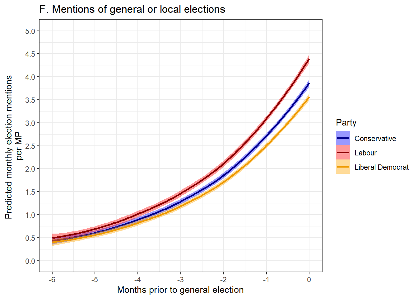 ggplot(newdata1, aes(x = months_prior, y = phat_elect_cool_kids, colour = main_party_name, fill = main_party_name)) +#geom_point() +#geom_line() +geom_smooth(method ="loess", se =TRUE, formula = y ~ x) +#facet_wrap(~ main_party_name) +labs(x ="Months prior to general election", y ="Predicted monthly election mentions \nper MP",colour ="Party",fill ="Party",title ="F. Mentions of general or local elections") +scale_colour_manual(values =c("Conservative"="blue4", "Labour"="red4", "Liberal Democrat"="orange2")) +scale_fill_manual(values =c("Conservative"="blue", "Labour"="red", "Liberal Democrat"="orange")) +scale_x_continuous(breaks =seq(-6, 0, by =1) ) +scale_y_continuous(breaks =seq(0, 5, by = .5) ) +coord_cartesian(xlim =c(-6, 0), ylim =c(0, 5)) +theme(axis.text =element_text(size =14), axis.title =element_text(size =17), plot.title =element_text(size =18, hjust =0.5),legend.text =element_text(size =16),legend.title =element_text(size =18) ) +theme_bw()
